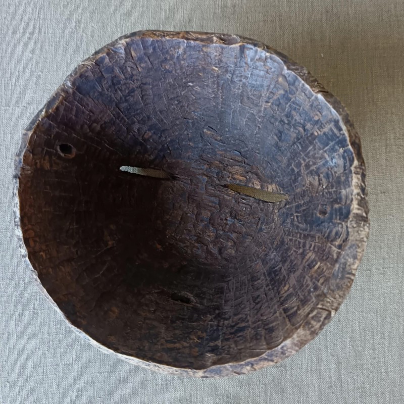 Le décor strié et symétrique épouse la forme du pourtour des yeux évidés, en amandes allongées, accentuant l'intensité du regard plissé, également grâce à l’effet d’alternance et de mélange de la patine sombre et claire, avec en point de contraste à l'horizontalité, le nez triangulaire en relief naissant du point de liaison des deux cavités des yeux, scindant le visage en deux. Et de la bouche en arête, en opposition de l’uniformité des stries, le carré de la bouche, d’où le spectateur s’attend à entendre la voix.