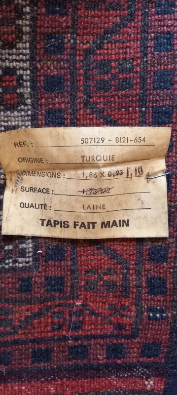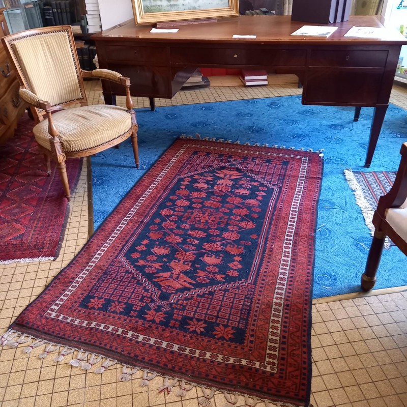 Grand médaillon central avec fleurs stylisées rouges sur fond bleu nuit