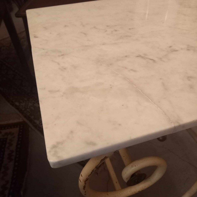 Table de Boucher ou de Pâtissier Piètement métal laqué blanc Dessus de marbre (accident et restauration au marbre) Epoque fin XIXe / début XXe Ht. 72 x 91,5 x 59,5