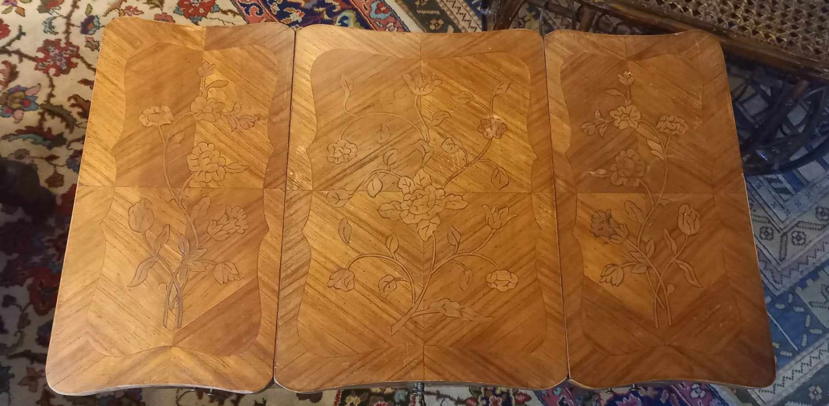 Coiffeuse En bois de placage, motifs de fleurs sur le plateau à trois parties ouvrant sur des niches en ceinture tablette écritoire, deux petits tirois et trois faux tiroirs Epoque milieu du XXe siècle, de style Louis XV Ht 75x 78 x 45 - 360 € -